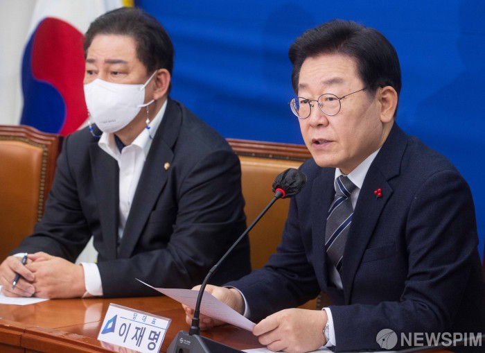 [서울=뉴스핌] 윤창빈 기자 = 이재명 더불어민주당 대표가 6일 오후 서울 여의도 국회에서 열린 평화⋅안보대책위원회 긴급회의에서 모두발언을 하고 있다. 2023.01.06 pangbin@newspim.com