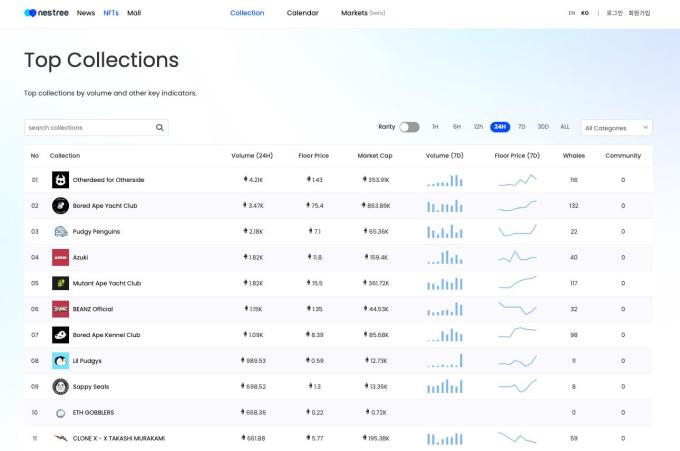 해당 서비스는 NFT시장의 주요 콜렉션 순위를 리스팅하고 각 콜렉션별로 OverView, Holder, Activity의 정보 및 각 콜렉션의 독립적인 Community 공간을 제공한다.
