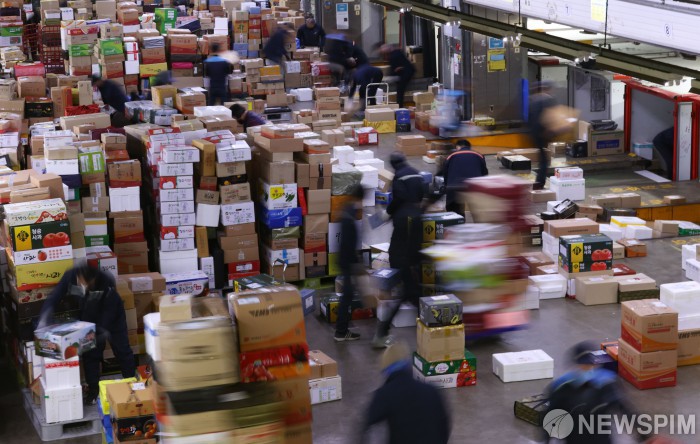 [서울=뉴스핌] 황준선 기자 = 설 명절을 열흘가량 앞둔 12일 오전 서울 광진구 동서울우편물류센터에서 작업자들이 택배 분류 작업을 하고 있다. 우정사업본부는 26일까지 '설 명절 우편물 특별소통기간'으로 지정, 전국 24개 집중국 및 4개 물류센터를 최대로 운영하는 비상근무체계에 돌입한다. 2023.01.12 hwang@newspim.com