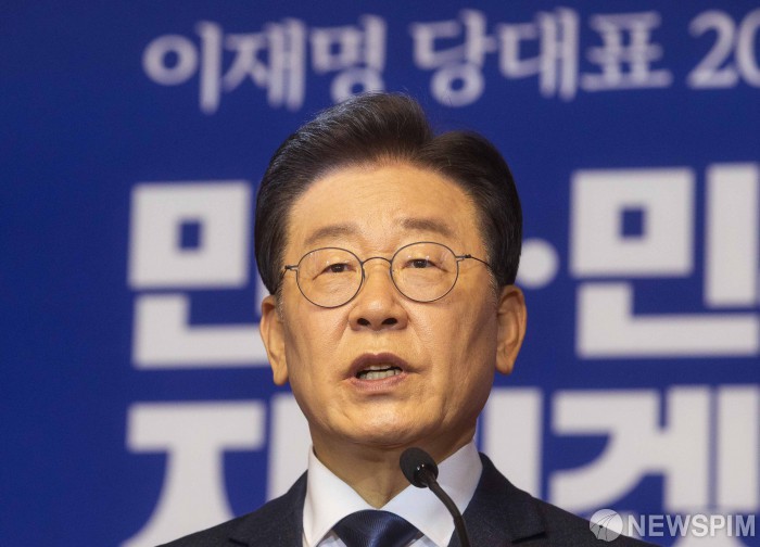 [서울=뉴스핌] 윤창빈 기자 = 이재명 더불어민주당 대표가 12일 오전 서울 여의도 국회 사랑재에서 열린 신년 기자회견에서 기자회견문을 낭독하고 있다. 2023.01.12 pangbin@newspim.com