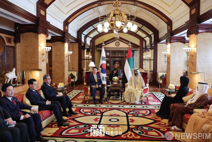 [서울=뉴스핌] 윤석열 대통령이 17일(현지시간) 두바이 자빌궁에서 하메드 빈 라시드 알 막툼 UAE 총리 겸 두바이 통치자와 와 면담하고 있다. [사진=대통령실] 2023.01.17 photo@newspim.com