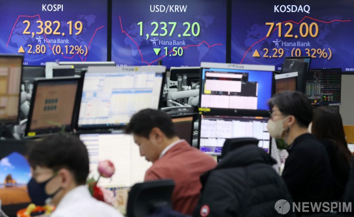 [서울=뉴스핌] 정일구 기자 = 18일 코스피 지수가 전 거래일보다 0.97포인트(0.04%) 오른 2380.36에 출발했다. 코스닥 지수는 전 거래일 대비 1.41포인트(0.2%) 상승한 711.12에 시작했다. 원·달러 환율은 전 거래일보다 0.3원 오른 1239원에 장을 열었다. 이날 오전 서울 중구 하나은행 딜링룸에서 딜러들이 업무를 보고 있다. 2023.01.18 mironj19@newspim.com