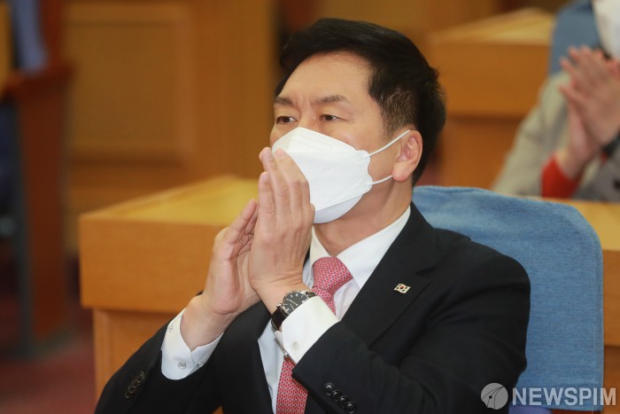 [서울=뉴스핌] 이형석 기자 = 당대표에 도전하는 김기현 국민의힘 의원이 25일 오후 서울 여의도 국회 의원회관에서 열린 지속 발전 가능한 폐기물 매립 및 친환경적 활용방안 토론회에서 박수를 치고 있다. 2023.01.25 leehs@newspim.com