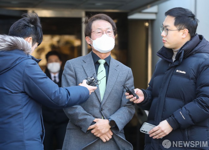 [서울=뉴스핌] 김보나 인턴기자 = 전국교직원노동조합의 요구에 따라 ‘해직 교사를 부당 채용’ 혐의로 기소된 조희연 서울시교육감이 27일 오후 서울 서초구 서울중앙지방법원에서 열린 1심 선고 공판에서 집행유예를 선고 받은 뒤 입장을 밝히고 있다. 2023.01.27 anob24@newspim.com