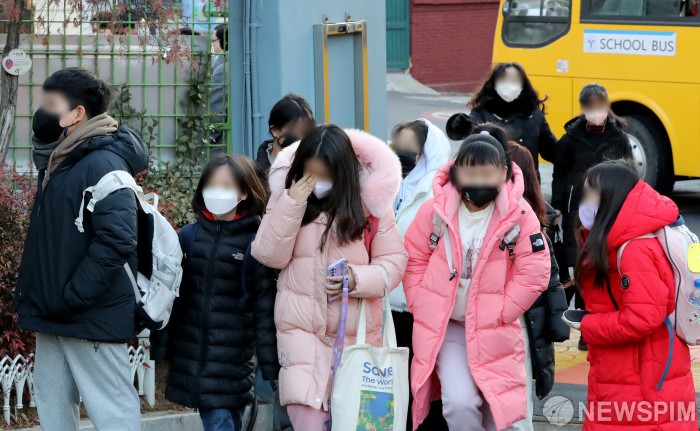 [서울=뉴스핌] 정일구 기자 = 실내 마스크 착용 의무가 해제된 30일 오전 서울 광진구 광장초등학교에서 학생들이 마스크를 착용한 채 등교하고 있다. 정부는 이날 0시부터 대중교통과 의료시설, 감염취약시설 등 일부 시설을 제외한 실내에서 마스크 착용 의무를 권고로 조정했다. 2023.01.30 mironj19@newspim.com