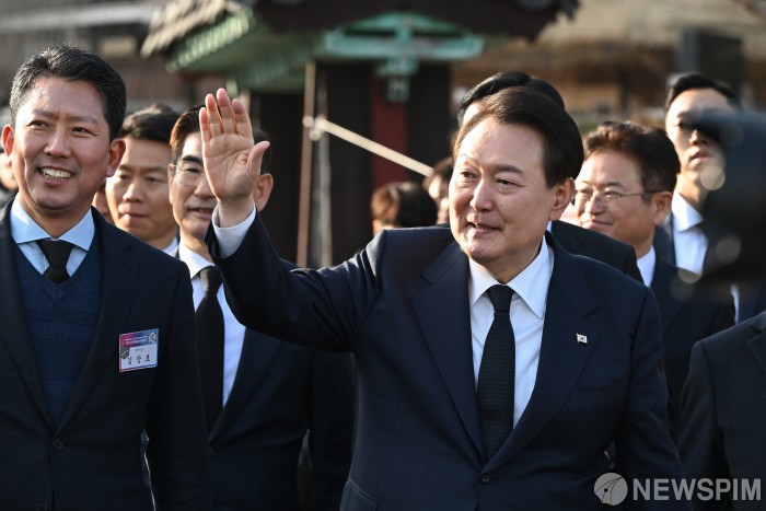 [서울=뉴스핌] 윤석열 대통령이 1일 경북 구미시 고(故) 박정희 전 대통령 생가를 방문한 뒤 시민들에게 인사하고 있다. [사진=대통령실] 2023.02.01 photo@newspim.com