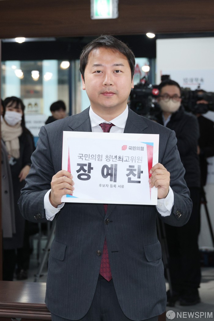 [서울=뉴스핌] 이형석 기자 = 장예찬 국민의힘 청년재단 이사장이 2일 오전 서울 여의도 중앙당사에서 청년최고위원 후보 등록을 하고 있다. 2023.02.02 leehs@newspim.com