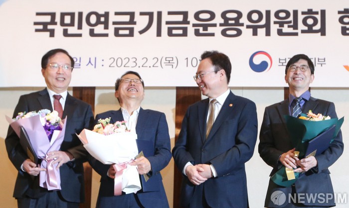 [서울=뉴스핌] 김보나 인턴기자 = 2일 오전 서울 중구 웨스틴 조선 서울에서 열린 '국민연금기금운용위원회 합동 연찬회'에서 조규홍 보건복지부장관(오른쪽 두 번째)이 상근전문위원들과 기념촬영을 하고 있다. 2023.02.02 anob24@newspim.com