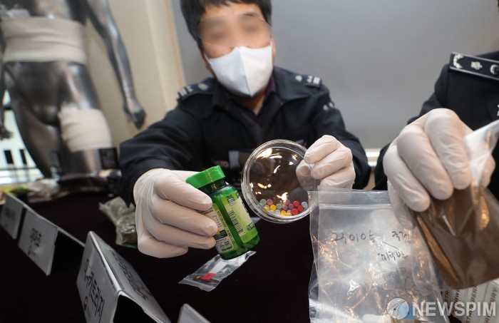 [서울=뉴스핌] 최승주 인턴기자 = 2일 오후 서울세관에서 관세청 직원들이 마약류 밀수 단속품들을 설명하고 있다. 이날 관세청은 '마약밀수 단속 종합대책' 및 '22년 마약류 밀수 단속 동향'을 발표했다. 2023.02.02 seungjoochoi@newspim.com