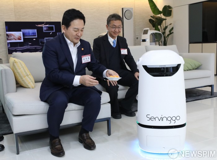 [서울=뉴스핌] 황준선 기자 = 원희룡 국토교통부 장관이 2일 오후 서울 강서구 LG 사이언스파크에서 열린 스마트플러스빌딩 얼라이언스 출범식에서 서빙로봇을 체험하고 있다. 2023.02.02 hwang@newspim.com