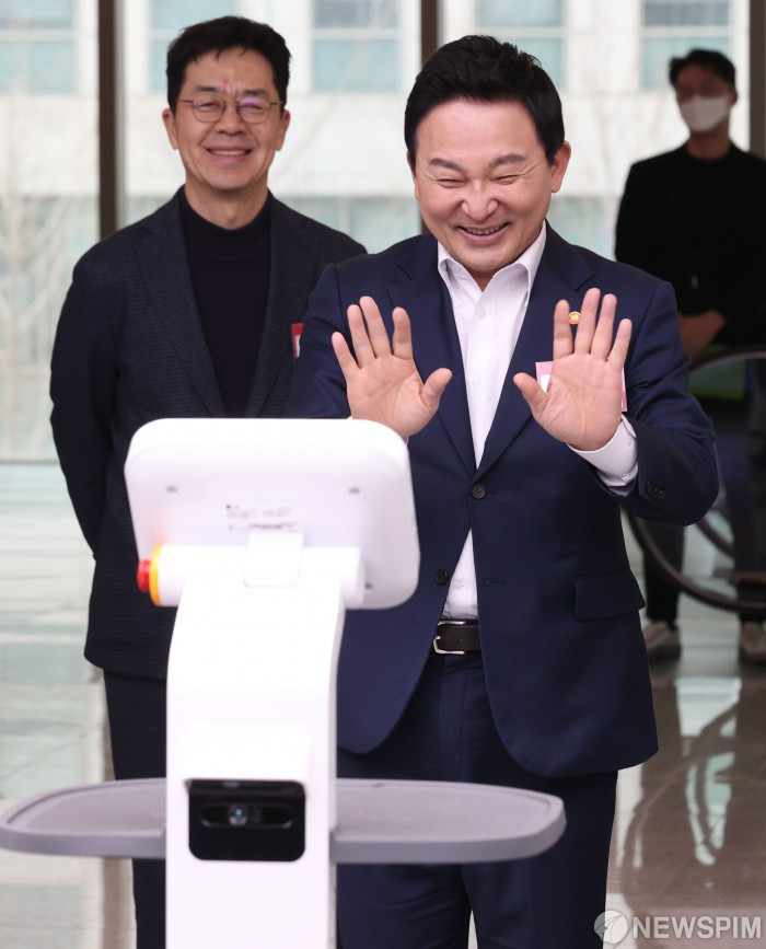 [서울=뉴스핌] 황준선 기자 = 원희룡 국토교통부 장관이 2일 오후 서울 강서구 LG 사이언스파크에서 열린 스마트플러스빌딩 얼라이언스 출범식에서 로봇과 인사하고 있다. 2023.02.02 hwang@newspim.com