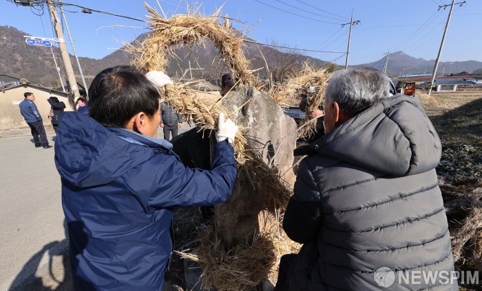 [강진=뉴스핌] 조은정 기자 = 정월대보름인 5일 전남 강진군 군동면 화방마을 주민들이 마을 어귀의 선돌(입석)에 마을주민의 안녕과 풍년을 기원하며 볏짚으로 만든 옷을 입히고 있다. 선돌 할머니와 선돌 할아버지로 불리는 2기의 입석은 마을수호신으로 매년 정월대보름이면 선돌 감기로 마을의 단합과 만복을 기원하고 마을잔치까지 곁들이는 세시풍속이지만 줄어드는 주민감소로 명맥만 유지하고 있다. [사진=강진군]2023.02.05 ej7648@newspim.com
