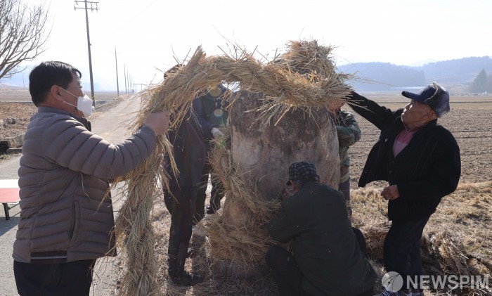 [강진=뉴스핌] 조은정 기자 = 정월대보름인 5일 전남 강진군 군동면 화방마을 주민들이 마을 어귀의 선돌(입석)에 마을주민의 안녕과 풍년을 기원하며 볏짚으로 만든 옷을 입히고 있다. 선돌 할머니와 선돌 할아버지로 불리는 2기의 입석은 마을수호신으로 매년 정월대보름이면 선돌 감기로 마을의 단합과 만복을 기원하고 마을잔치까지 곁들이는 세시풍속이지만 줄어드는 주민감소로 명맥만 유지하고 있다. [사진=강진군]2023.02.05 ej7648@newspim.com