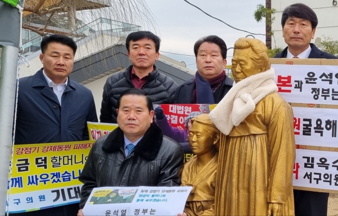 [광주=뉴스핌] 조은정 기자 = 광주시 무소속 기초의원들로 구성된 '광주시 무소속 기초의원단'이 한일역사정의평화행동 주관 양금덕 할머니와 함께하는 한일굴욕외교철회를 위한 전국 500곳 1인시위에 동참했다.