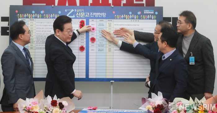 [서울=뉴스핌] 이형석 기자 = 이재명 더불어민주당 대표가 24일 오전 서울 여의도 국회에서 열린 을지로위원회 상생 꽃달기에서 크린토피아 본사와 가맹지사 간 자발적 상생협약 체결을 기념하며 꽃을 달고 있다. 2023.02.24 leehs@newspim.com