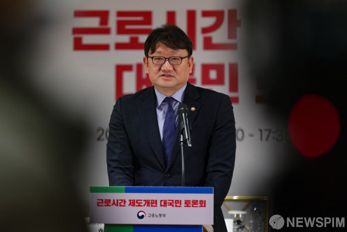 [서울=뉴스핌] 황준선 기자 = 권기섭 고용노동부 차관이 24일 오후 서울 중구 로얄호텔에서 열린 근로시간 제도 개편 대국민 토론회에서 인사말을 하고 있다. 2023.02.24 hwang@newspim.com