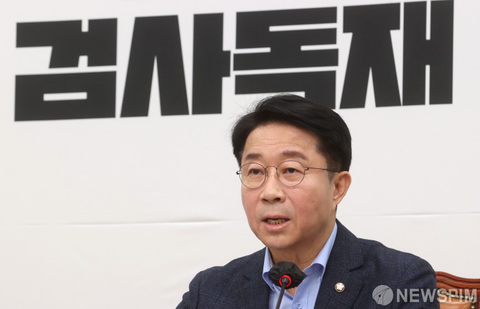 [서울=뉴스핌] 김학선 기자 = 더불어민주당 조정식 사무총장이 26일 오전 서울 여의도 국회에서 기자간담회를 하고 있다. 2023.02.26 yooksa@newspim.com