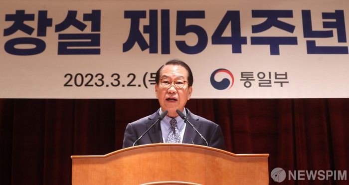 [서울=뉴스핌] 김학선 기자 = 권영세 통일부 장관이 2일 서울 종로구 정부서울청사 별관에서 열린 '통일부 창설 제54주년 기념식'에서 기념사를 하고 있다. 2023.03.02 yooksa@newspim.com