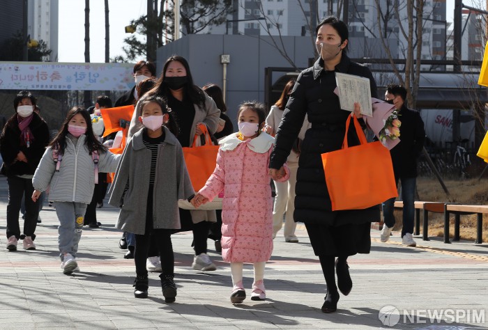 [서울=뉴스핌] 정일구 기자 = 2일 오전 서울 강동구 강빛초등학교에서 1학년 신입생들이 학부모와 함께 입학식에 참석하고 있다. 이날 전국 초·중·고교가 2019년 이후 4년 만에 실내 마스크 착용 의무 없이 대면 입학식을 치르고 새 학기를 시작했다. 2023.03.02 mironj19@newspim.com