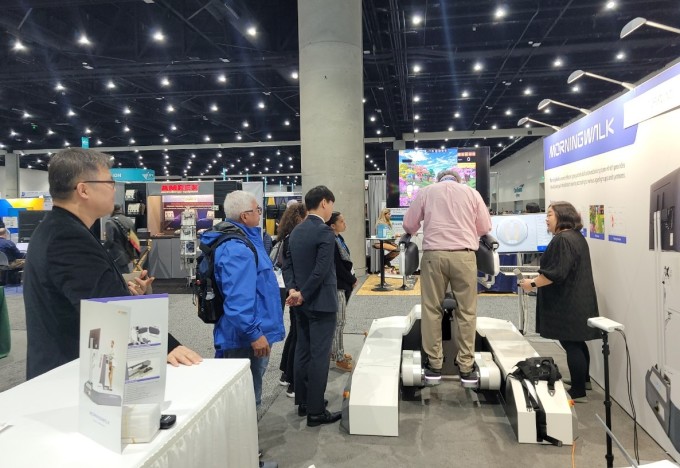 부스를 방문한 협회 참가자들을 대상으로 착석형 체중지지 시스템과 발판기반형 보행 재활 로봇 시스템의 다양한 보행 패턴, 좌우 발판 파라미터의 분리 제어 기능, 탑승 하차 모드 및 훈련 결과에 대한 설명을 중심으로 시현하고 관심도가 높은 참가자들에게 모닝워크 관련 연구 문헌을 배포하였다. 특히, 직접 모닝워크 체험에 참가한 참가자들은 글로벌 하지재활로봇들과 달리 착석형 체중지지 시스템과 발판기반형 타입이 '모닝워크'만의 유니크 한 특징으로 보행 훈련 중 환자의 능동적 참여를 향상시키기 위한 궤적가변모드, 속도가변모드, 구간반복훈련모드로 치료 효과를 높여주는 기능에 대하여 높은 관심도를 표출하였으며 성인 및 소아 일체형 시스템, 다양한 가상현실(VR) 모드를 통한 환자들의 흥미 향상에 대해서도 높은 관심과 공감을 제시했다.