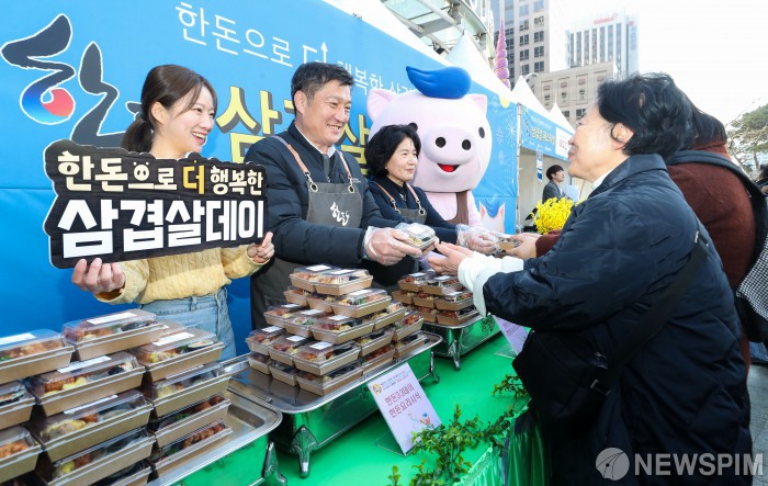 [서울=뉴스핌] 김보나 인턴기자 = 3일 오전 서울 종로구 청계광장 앞에서 열린 삼겹살데이 20주년 기념 '한돈으로 더 행복한 삼겹살데이 행사에서 손세희 한돈자조금관리위원회 위원장이 삼겹살데이를 홍보하고 있다. 2023.03.03 anob24@newspim.com