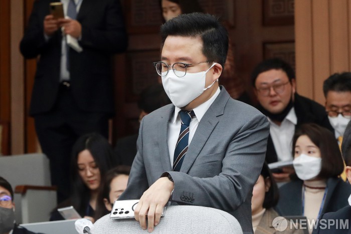 [서울=뉴스핌] 이형석 기자 = 김태호 하이브 최고운영책임자가 3일 오전 서울 여의도 국회에서 열린 수출 전략 민‧당‧정협의회에 참석하고 있다. 2023.03.03 leehs@newspim.com