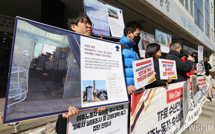 [서울=뉴스핌] 황준선 기자 = 3일 오전 서울 중구 서울지방고용노동청 앞에서 민주노총, 이주노동자평등연대 관계자들이 이주노동자 숙식비지침·열악한 기숙사 개선 없는 고용노동부 규탄 기자회견을 하고 있다. 2023.03.03 hwang@newspim.com
