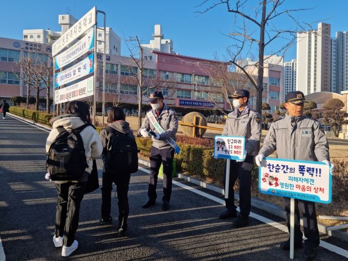 사회적 거리두기 해제로 학교폭력 및 소년범 발생이 최근 증가함에 따라 진행한 이날 캠페인애서는 경찰관들이 등굣길 학생을 대상으로 관련 자료를 배부·전시했다.
