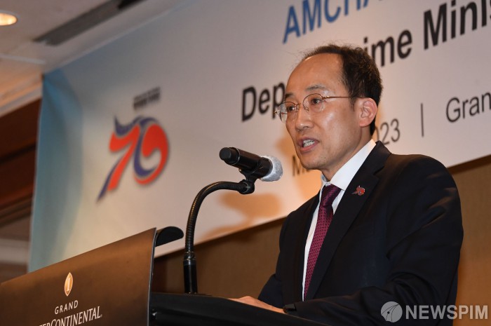 [서울=뉴스핌]추경호 부총리 겸 기획재정부 장관이 8일 서울 강남구 그랜드 인터컨티넨탈 호텔에서 열린 주한 미국기업 간담회에서 기조연설을 하고 있다.[사진=기획재정부] 2023.03.08 photo@newspim.com