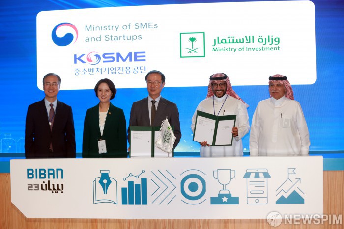 [서울=뉴스핌] 이영 중소벤처기업부 장관(왼쪽에서 두 번째)이 9일(현지시간) 사우디아라비아 리야드 전시컨벤션 센터에서 진행된 중소벤처기업진흥공단-MISA 협력프로그램 체결식에 임석하고 있다.[사진= 중소벤처기업부 ] 2023.03.10 photo@newspim.com