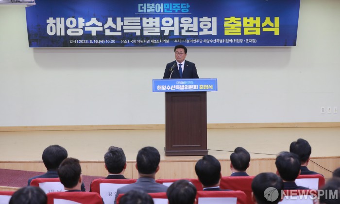 [서울=뉴스핌] 이형석 기자 = 윤재갑 위원장이 16일 오전 서울 여의도 국회 의원회관에서 열린 해양수산특별위원회 출범식에서 인사말을 하고 있다. 2023.03.16 leehs@newspim.com