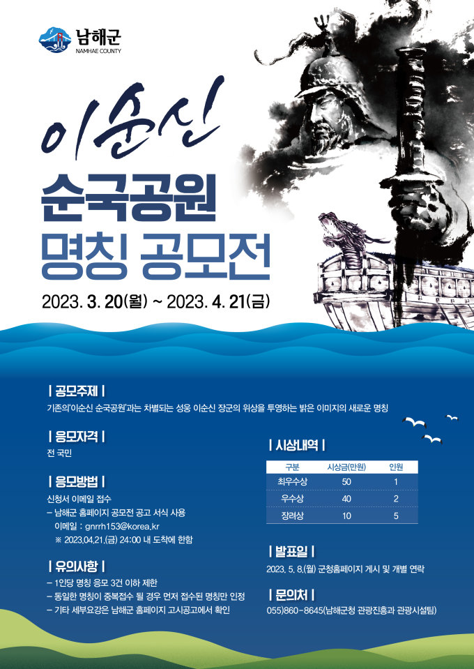 [남해=뉴스핌] 최민두 기자 = 경남 남해군은 20일부터 4월 21일까지 '이순신 순국공원 명칭 공모전'을 개최한다고 밝혔다.