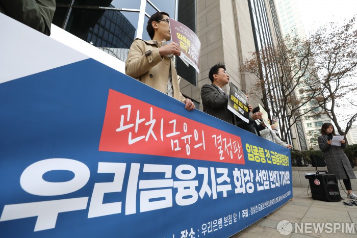 [서울=뉴스핌] 황준선 기자 = 우리금융지주의 주주총회가 열린 24일 오전 서울 중구 우리은행 본점 앞에서 경실련, 참여연대 등 시민사회단체원들이 임종룡 전 금융위원장의 우리금융지주 회장 선임 반대 기자회견을 하고 있다. 2023.03.24 hwang@newspim.com