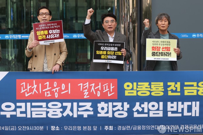 [서울=뉴스핌] 황준선 기자 = 우리금융지주의 주주총회가 열린 24일 오전 서울 중구 우리은행 본점 앞에서 경실련, 참여연대 등 시민사회단체원들이 임종룡 전 금융위원장의 우리금융지주 회장 선임 반대 기자회견을 하고 있다. 2023.03.24 hwang@newspim.com