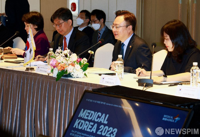 [서울=뉴스핌]조규홍 보건복지부 장관이 24일 오전 서울 중구 앰버서더 풀만 호텔에서 열린 부디 구나디 사디킨(Budi Gunadi Sadikin) 인도네시아 보건부 장관과 면담에서 인사말을 하고 있다. [사진=보건복지부] 2023.03.24 photo@newspim.com