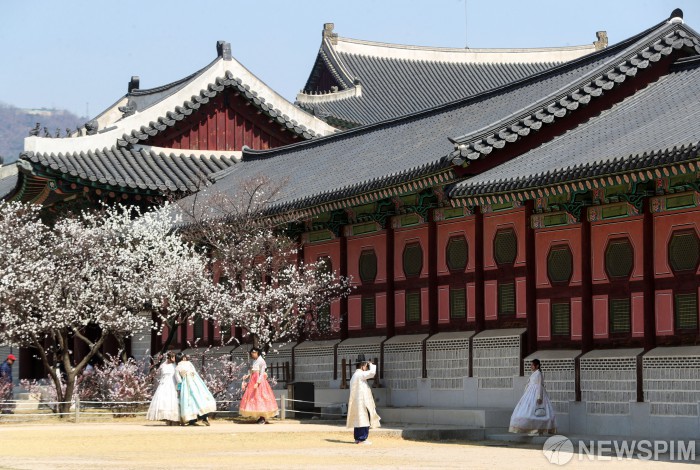 [서울=뉴스핌] 김보나 인턴기자 = 봄꽃이 만개한 27일 오후 서울 종로구 경복궁에서 관광객들이 고궁과 꽃을 배경으로 사진촬영을 하고 있다. 2023.03.27 anob24@newspim.com