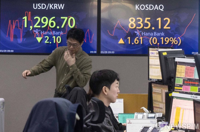 [서울=뉴스핌] 윤창빈 기자 = 29일 코스피는 전 거래일(2434.94)보다 2.31포인트(0.09%) 내린 2432.63에 개장했다. 코스닥지수는 전 거래일(833.51)보다 0.39포인트(0.05%) 상승한 833.90에 거래를 시작했다. 서울 외환시장에서 원·달러 환율은 전 거래일(1298.8원)보다 2.2원 하락한 1296.6원에 출발했다. 이날 서울 중구 하나은행 딜링룸에서 딜러들이 업무를 보고 있다. 2023.03.29 pangbin@newspim.com