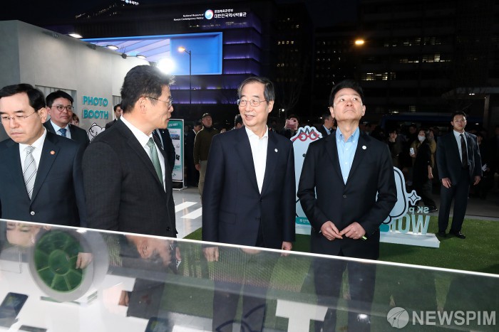 [서울=뉴스핌] 정일구 기자 = 한덕수 국무총리가 30일 오후 서울 종로구 광화문광장에서 열린 2030 부산세계박람회(엑스포) 유치기원 '광화에서 빛;나이다' 점등식에 참석해 SK 부스를 둘러보고 있다. 2023.03.30 mironj19@newspim.com