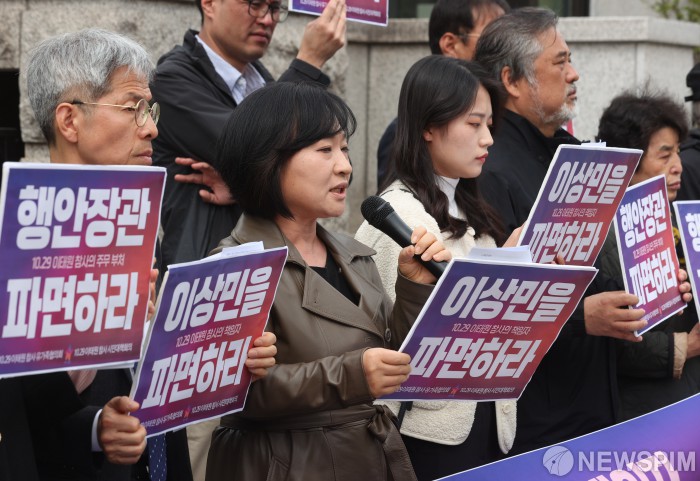[서울=뉴스핌] 황준선 기자 = 10.29 이태원 참사의 책임으로 국회에서 탄핵 소추안이 가결돼 재판에 넘겨진 이상민 행전안전부 장관의 탄핵 심판이 시작되는 4일 오전 서울 종로구 헌법재판소 앞에서 열린 이상민 장관의 파면을 촉구 기자회견에서 희생자 이지한씨의 어머니 조미은씨가 발언하고 있다. 2023.04.04 hwang@newspim.com