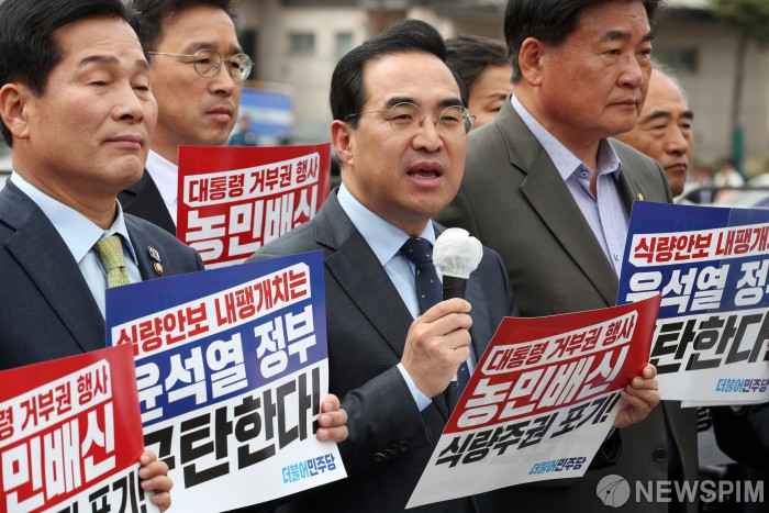 [서울=뉴스핌] 정일구 기자 = 박홍근 더불어민주당 원내대표가 4일 오전 서울 용산구 대통령실 앞에서 열린 '쌀값 정상화법' 대통령 거부권 행사 규탄 기자회견에서 발언하고 있다. 2023.04.04 mironj19@newspim.com