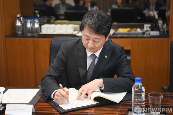 [서울=뉴스핌]안덕근 산업통상자원부 통상교섭본부장이 7일 서울 소공동 롯데호텔에서 열린 한-도미니카공화국 무역투자촉진프레임워크(TIPF) 서명식에서 협정서에 서명하고 있다. [사진=산업통상자원부] 2023.04.07 photo@newspim.com