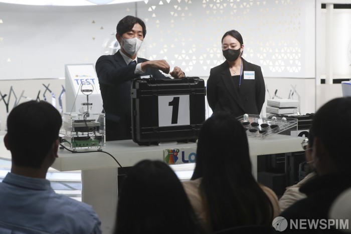 [서울=뉴스핌] 이형석 기자 = 8일 1062회차 로또6/45 추첨을 앞두고 동행복권 관계자가 방청객 앞에서 추첨공이 담긴 가방을 열고 있다. 2023.04.08 leehs@newspim.com