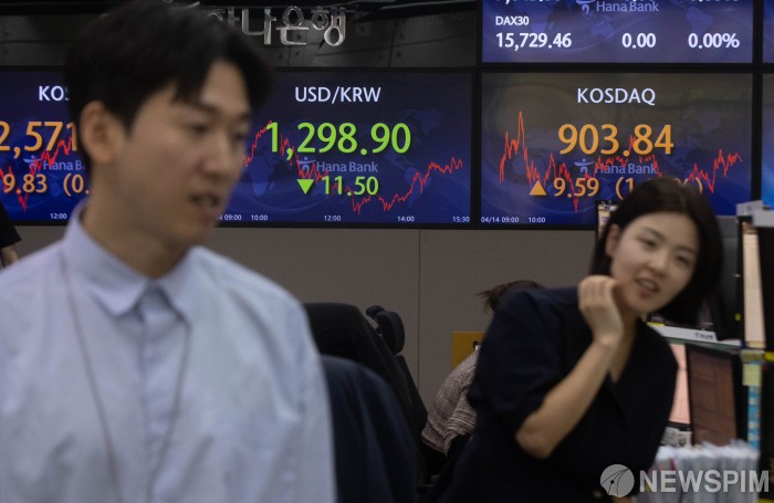 [서울=뉴스핌] 윤창빈 기자 = 14일 코스피는 전 거래일(2561.66)보다 9.83포인트(0.38%) 오른 2571.49에 장을 마쳤다. 코스닥지수는 전 거래일(894.25)보다 9.59포인트(1.07%) 상승한 903.84에 거래를 종료했다. 서울 외환시장에서 원·달러 환율은 전 거래일(1310.4원)보다 11.5원 내린 1298.9원에 마감했다. 이날 서울 하나은행 딜링룸에서 딜러들이 업무를 보고 있다. 2023.04.14 pangbin@newspim.com