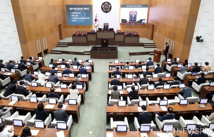 서울=뉴스핌] 김보나 인턴기자 = 김현기 서울시의회 의장이 14일 오후 서울 중구 서울시의회에서 열린 제318회 본회의에서 개회사를 하고 있다. 2023.04.14 anob24@newspim.com