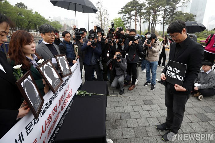 [서울=뉴스핌] 정일구 기자 = 18일 오전 서울 용산구 대통령실 인근에서 열린 전세사기‧깡통전세 문제 해결을 위한 시민사회대책위원회 출범 기자회견에서 참가단체 관계자들이 전세사기 피해 사망자를 추모하며 헌화를 하고 있다. 2023.04.18 mironj19@newspim.com