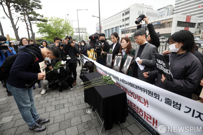 [서울=뉴스핌] 정일구 기자 = 18일 오전 서울 용산구 대통령실 인근에서 열린 전세사기‧깡통전세 문제 해결을 위한 시민사회대책위원회 출범 기자회견에서 참가단체 관계자들이 전세사기 피해 사망자를 추모하며 헌화를 하고 있다. 2023.04.18 mironj19@newspim.com