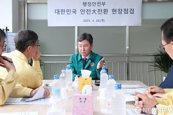 [서울=뉴스핌] 한창섭 행정안전부 차관이 20일 오전 경기도 성남시 분당구 수내동 황새울국민체육센터를 찾아 노후 교량 안전관리 현황을 청취하고 향후 개선방안에 관한 의견을 나누고 있다.[사진=행정안전부] 2023.04.20 photo@newspim.com