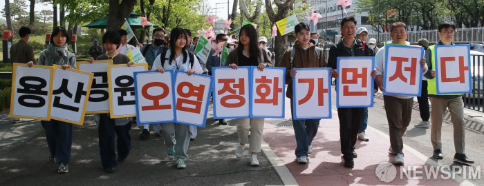 [서울=뉴스핌] 이형석 기자 = 서울환경연합이 23일 오전 서울 용산구 전쟁기념관 앞에서 5월 4일 용산기지 전면 개방을 앞두고 '오염정화가 먼저다'의 슬로건으로 만보걷기를 진행 하고 있다. 이날 서울환경연합은 전쟁기념관에서부터 국립중앙박물관까지, 용산미군기지 사우스포스트를 따라 걸으며 공원 개방에 앞서 환경오염 정화를 시행할 것을 촉구했다. 2023.04.23 leehs@newspim.com