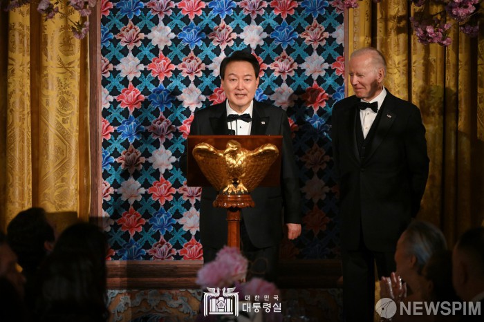 [서울=뉴스핌]윤석열 대통령이 26일(현지시간) 워싱턴DC 백악관에서 열린 국빈만찬에서 답사를 하고 있다. [사진=대통령실] 2023.04.27 photo@newspim.com