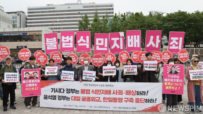 [서울=뉴스핌] 김학선 기자 = 윤석열 대통령과 기시다 후미오 일본 총리의 한일정상회담이 예정된 7일 오후 서울 용산구 대통령실 앞에서 평화와통일을여는사람들 회원들이 한일정상회담을 규탄하는 기자회견을 하고 있다. 2023.05.07 yooksa@newspim.com